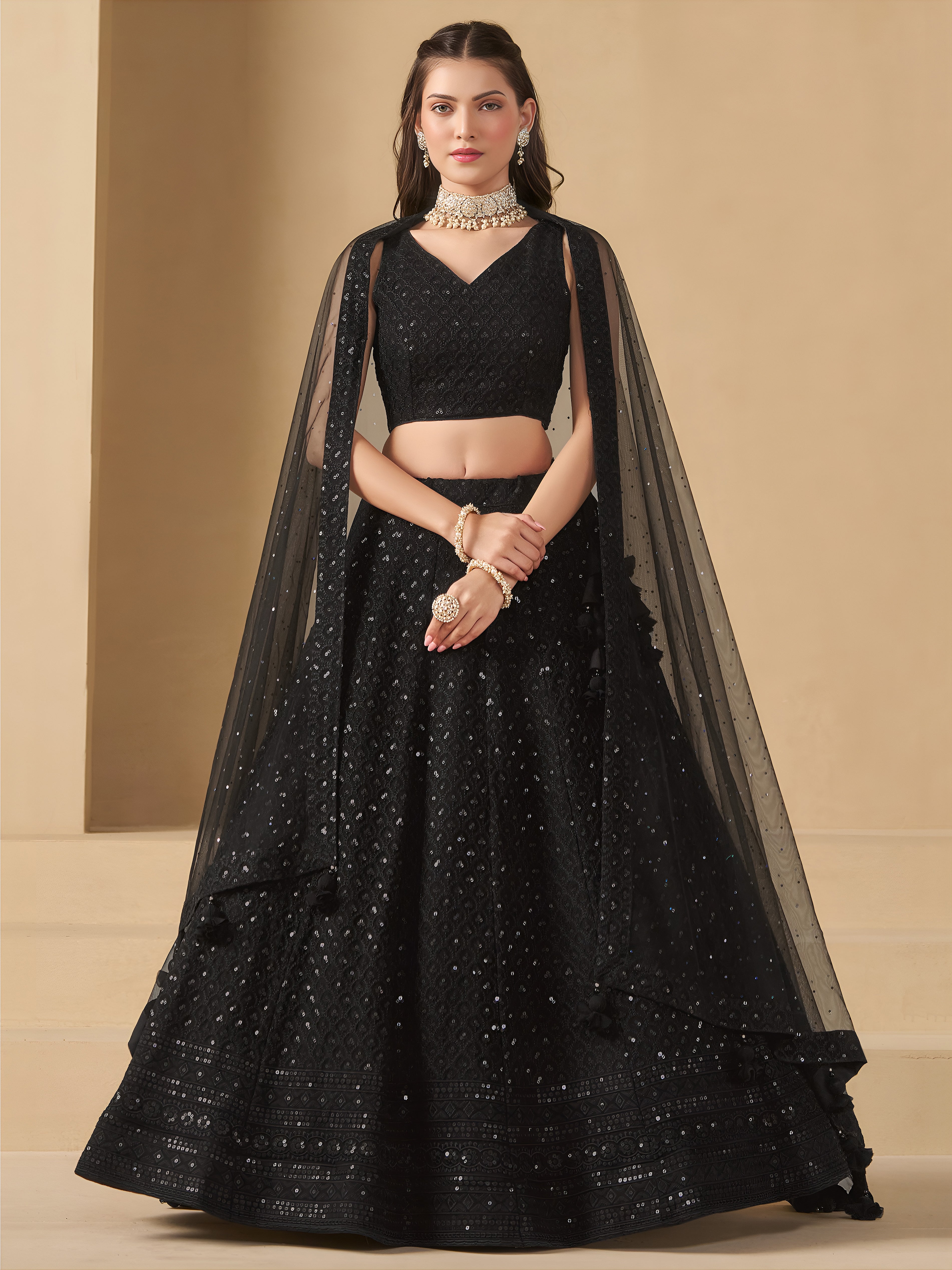 Color: Matching – The dupatta matches the black color of the lehenga and blouse, creating a seamless look.