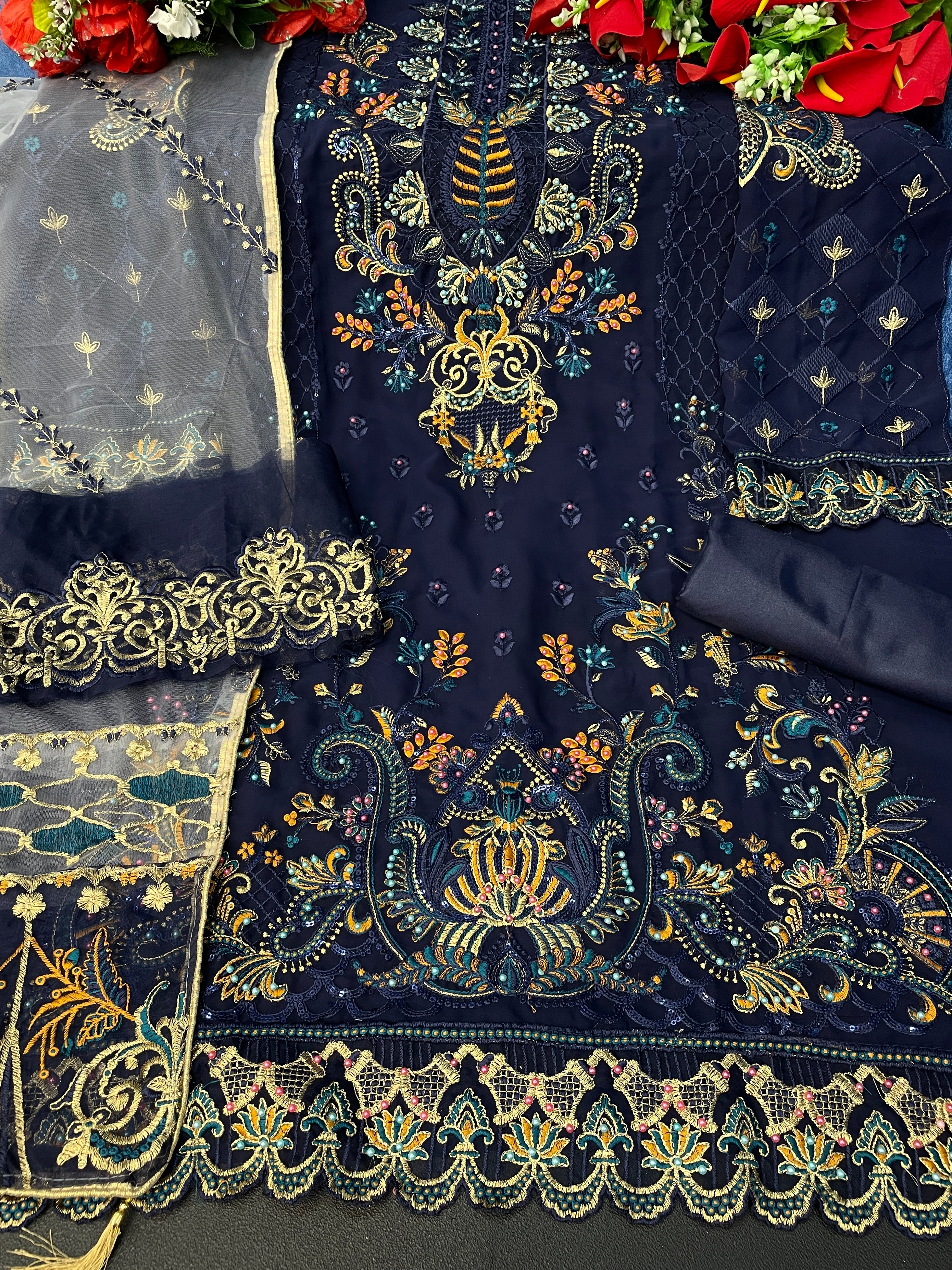 Blue Heavy Georgette With Embroidery Sequence Heavy Work Straight Top, Heavy Santoon Silk Bottom, Heavy Butterfly Net With Embroidery Full Heavy Work 4 Side Ready Made Lece Dupatta