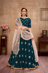 Wear this set with heavy jhumkas, jeweled hairpins, and embellished sandals to be the cynosure of all eyes.